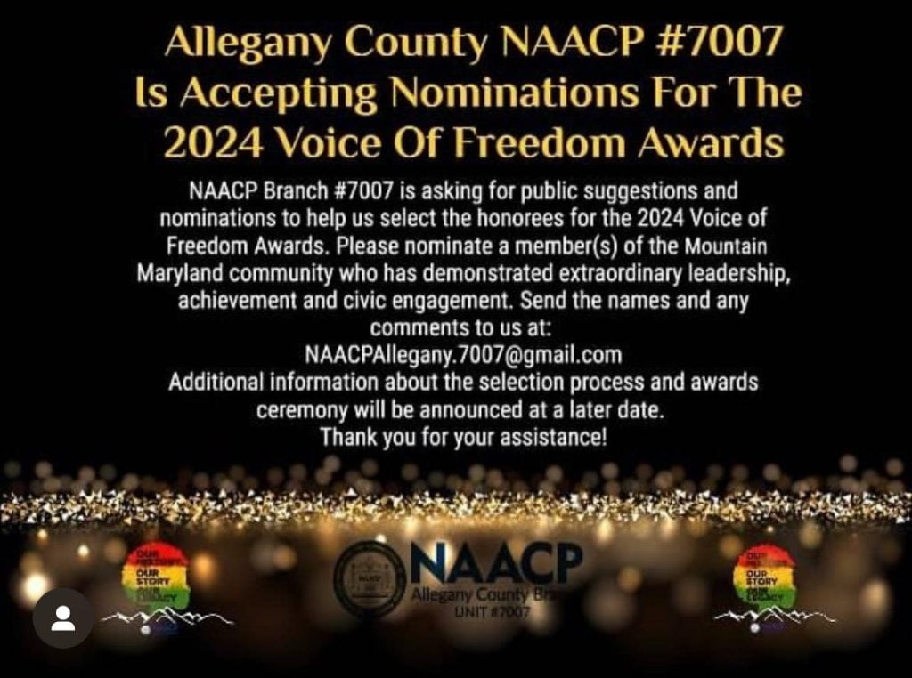 “@naacpallegany is asking the public to suggest nominees for the 2024 Voice of Freedom Awards. Don’t wait until after the event to say somebody was overlooked. This is the opportunity to nominate a local leader or volunteer who you notice making a difference in the community!”
